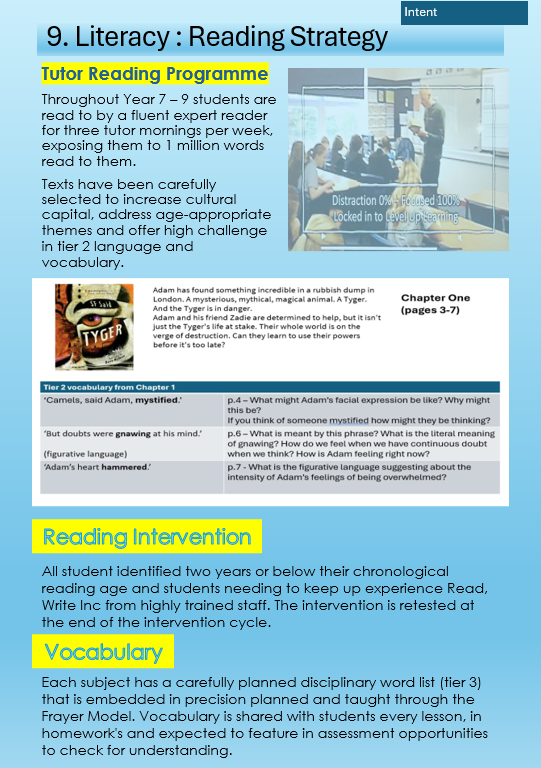The Academy places high value on ambitious vocabulary as part of high‑challenge, low‑threat teaching. Working with Nisha Tank and the National Literacy Trust, we have mapping Tier 2 language in our tutor reading books and Tier 3 academic language across curriculum subjects, ensuring vocabulary is: