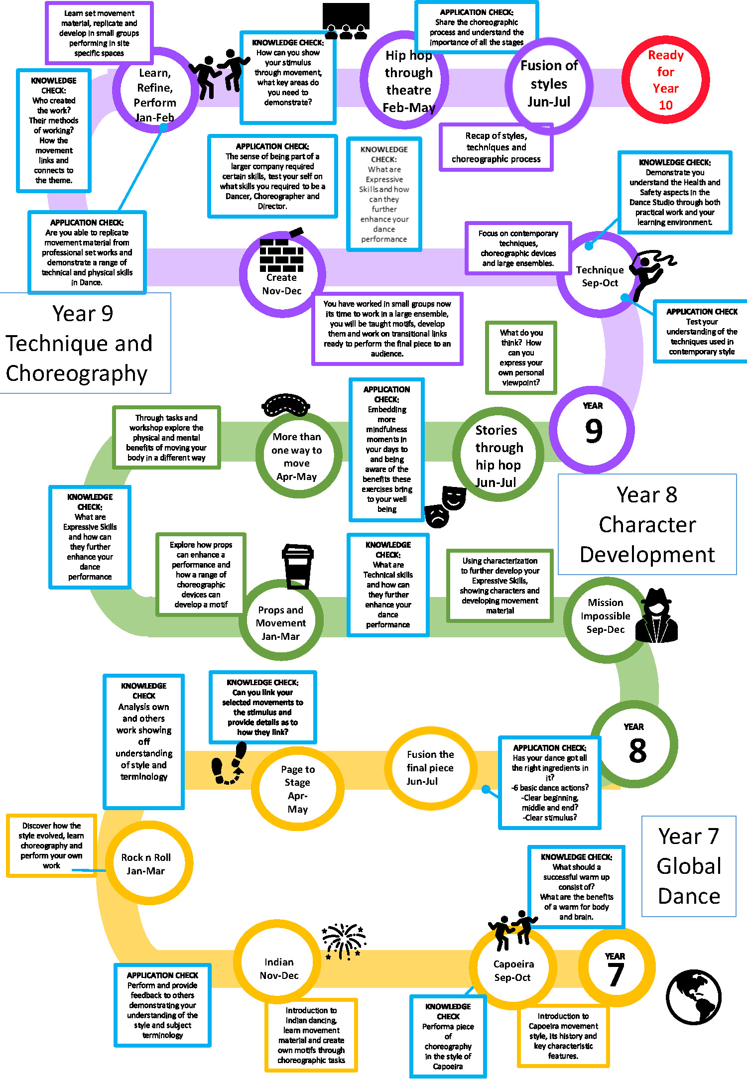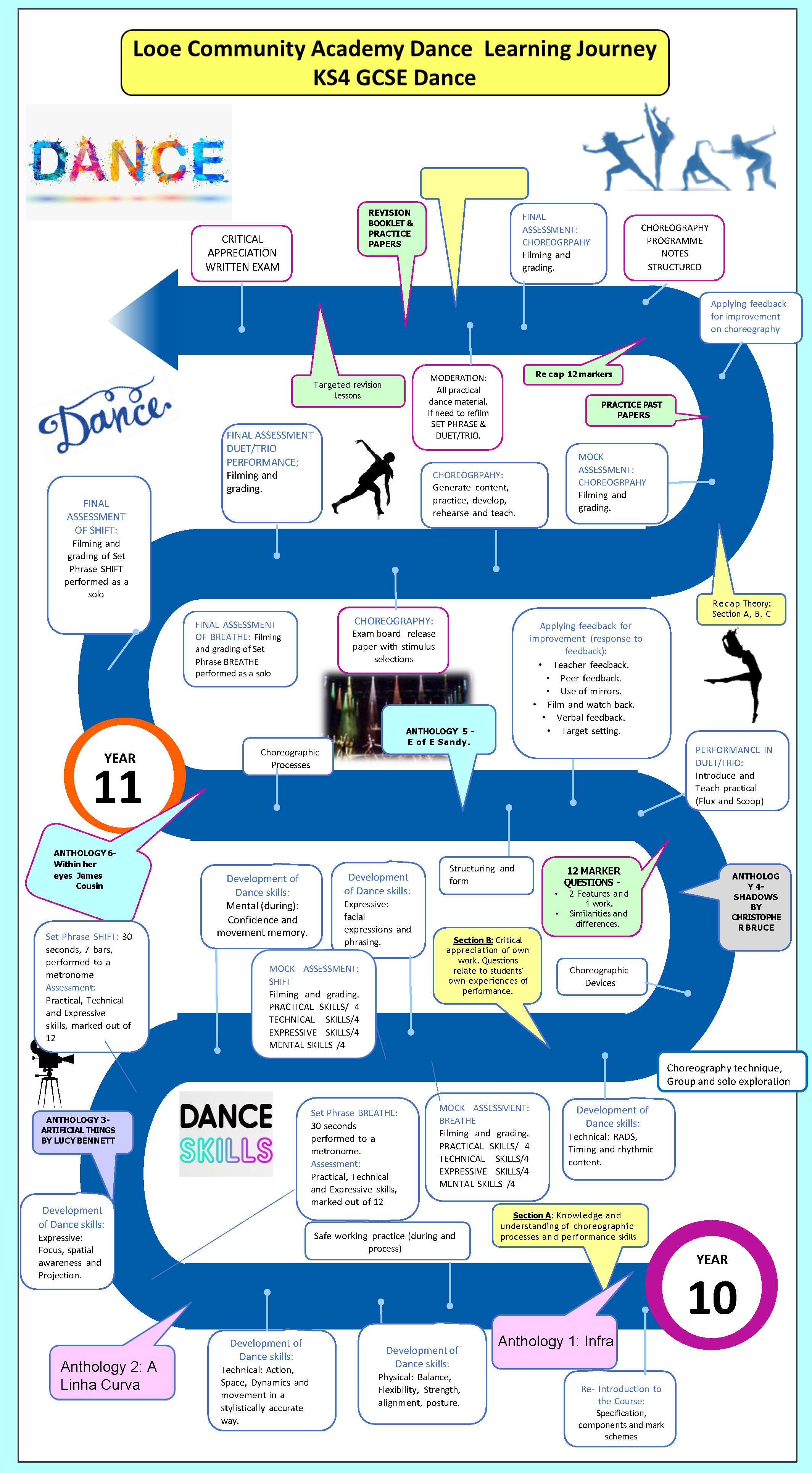 Key Stage 4: Students work at an advanced level, mastering physical, technical, and expressive skills. They study set works in depth, analyse choreographers’ intent, and create sophisticated choreography using complex devices and structures. Written analysis and evaluative skills are embedded throughout to prepare students for GCSE assessment.