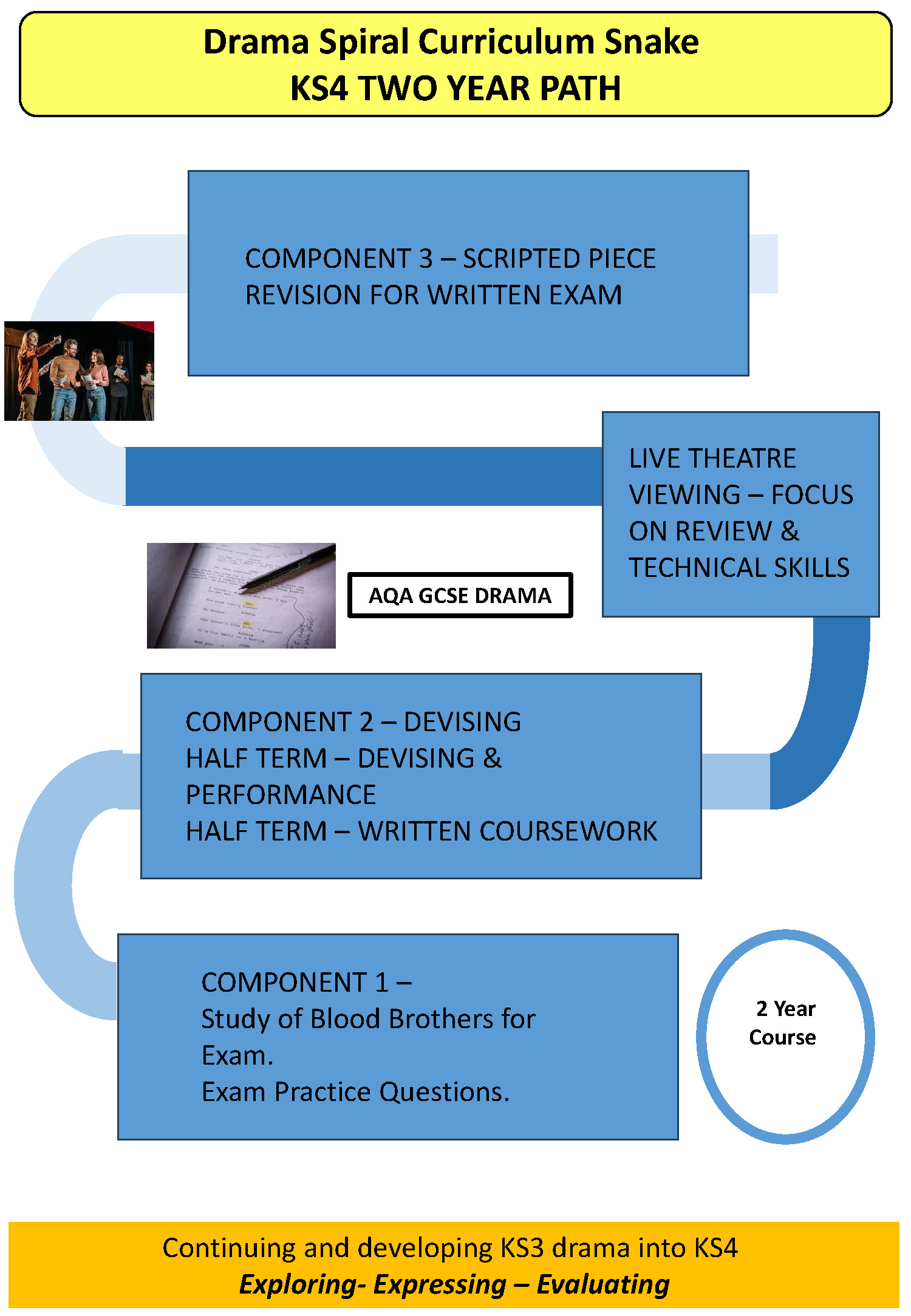 KS4: Students work at an advanced level, mastering technical and expressive skills. They study set texts, practitioner methods, and create sophisticated devised pieces using complex structures and conventions. Written analysis and evaluative skills are embedded to prepare for GCSE assessment.