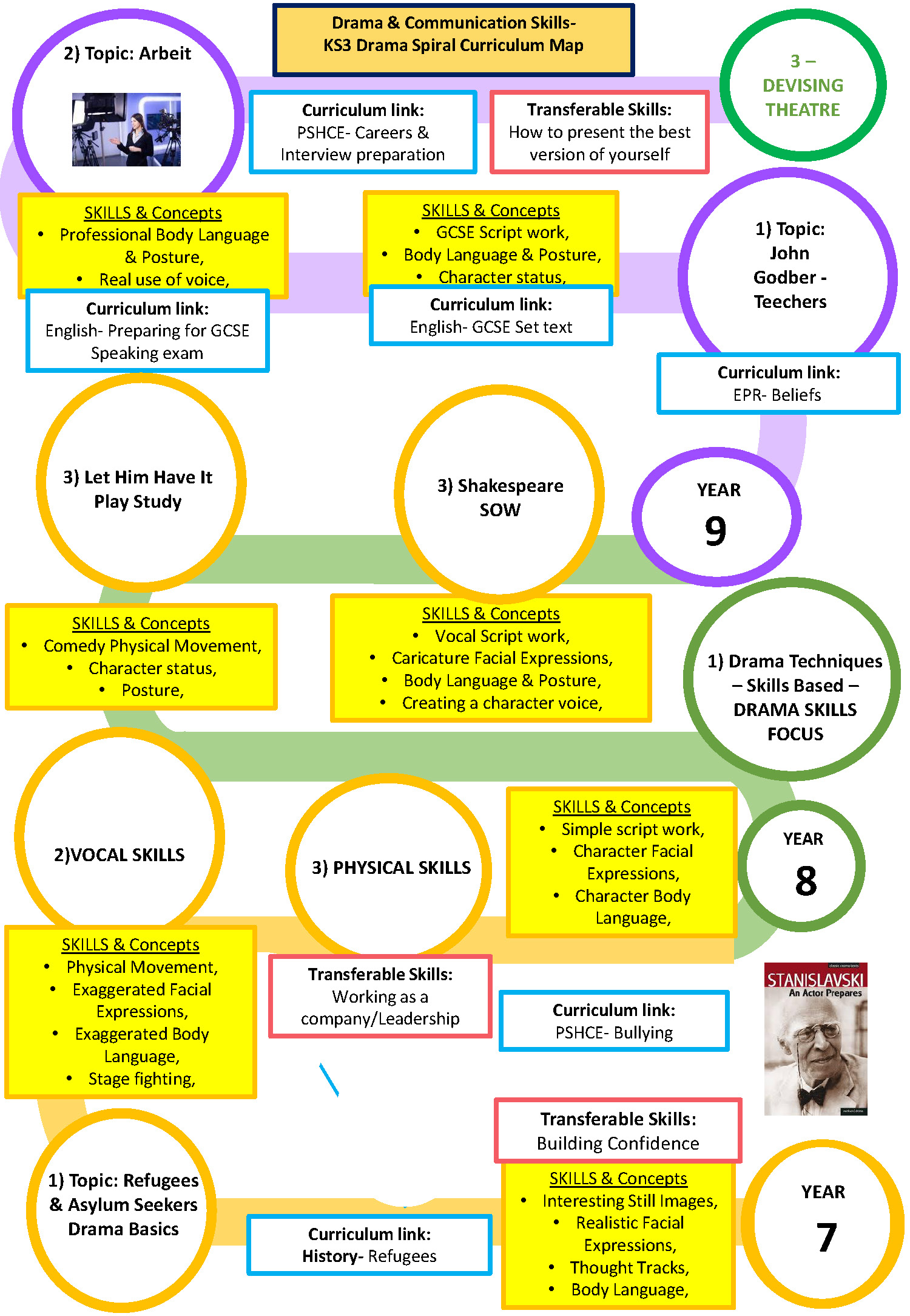 Year 9: Students deepen their understanding through satire, multi-role performance, and physical theatre inspired by Frantic Assembly. They refine vocal and physical skills and engage in extended analysis using subject-specific terminology.